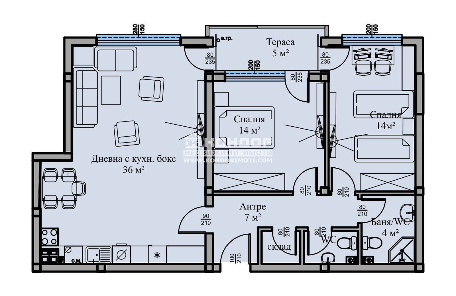 Оферта 61774:БЕЗ КОМИСИОН ОТ КУПУВАЧА!!! Предлагаме Ви възможността да си закупите тристаен апартамент в нискоетажна новоизградена жилищна сграда намираща се на тихо и спокойно място в близост до всички необходими комуникации, училища, детски градини, удобен транспорт и големи хранителни хипермаркети. Сградата е проектирана с изключително нисък процент общи части - 10%, което дава повече реална и използваема площ на стаите и създава максимален комфорт на своите ползватели. Жилището се състои от просторна дневна 36кв.м. с кухненски бокс и трапезария, две самостоятелни спални по 14кв.м., баня с тоалетна, втора тоалетна, перално, входно антре и една тераса обща за трите стаи. Перспективна ИНВЕСТИЦИЯ ЗА ОТДАВАНЕ ПОД НАЕМ!!! Изпълнението е осъществено с висококачествени материали и съвременни технологии, по европейски стандарт, шест камерна PVC дограма, блиндирана входна врата с 4-странно заключване, сензорно осветление, хидравлични асансьори с огледална кабина. Свободни паркоместа и партерни гаражи !!! Възможност за закупуване на разсрочено плащане в рамките на строителството или чрез Банков Кредит на изключително изгодни условия, договорени за клиенти на Агенция КОНДОР!!!