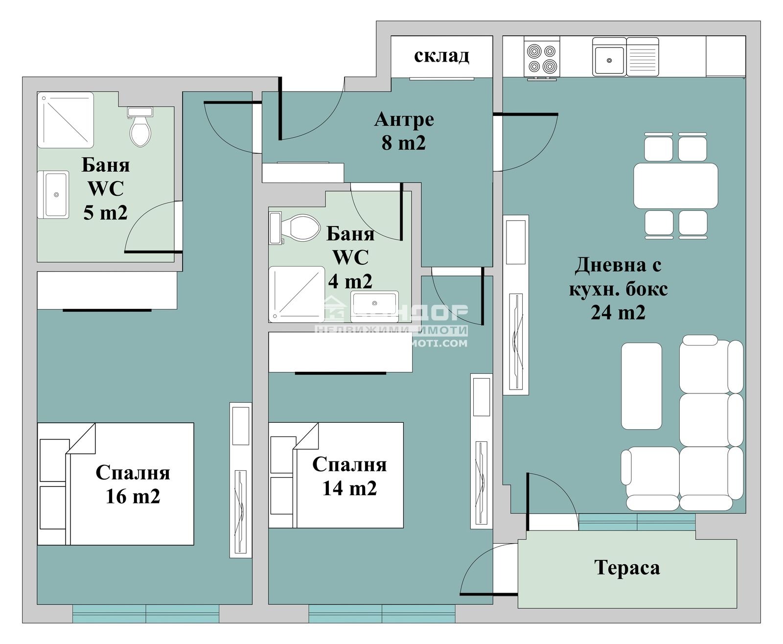 Разпределения - Тристаен апартамент, състоящ се от дневна с трапезария и кухненски бокс - 24 м2, детска спалня - 14 м2, голяма родителска спалня 16 м2 с прилежаща баня с тоалетна - 5 м2, второ санитарно помещение, входно антре с място за перален кът и една тераса.