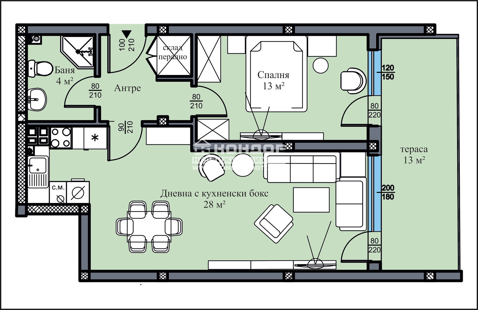 БЕЗ КОМИСИОН ОТ КУПУВАЧА!!! Предлагаме Ви възможността да си закупите двустаен апартамент в нискоетажана жилищна сграда намираща се на тихо и спокойно място в близост до всички необходими комуникации, училища, детски градини, удобен транспорт и големи хранителни хипермаркети. Сградата е проектирана проектирана с изключително нисък процент общи части - 10%, което дава повече реална и използваема площ на стаите и създава максимален комфорт на своите ползватели. Жилището се състои от дневна 28кв.м. с кухненски бокс и трапезария, голяма самостоятелна спалня 13кв.м., баня с тоалетна, перално, входно антре и една тераса обща за двете стаи. Перспективна ИНВЕСТИЦИЯ ЗА ОТДАВАНЕ ПОД НАЕМ!!! Изпълнението се осъществява с висококачествени материали и съвременни технологии, по европейски стандарт, шест камерна PVC дограма, блиндирана входна врата с 4-странно заключване, сензорно осветление, хидравлични асансьори с огледална кабина. Свободни Паркоместа на цени от 8000 евро и партерни Гаражи !!! Приложените снимки са от друга готова сграда на строителната фирма. Възможност за закупуване на разсрочено плащане в рамките на строителството или чрез Банков Кредит на изключително изгодни условия, договорени за клиенти на Агенция КОНДОР !!!