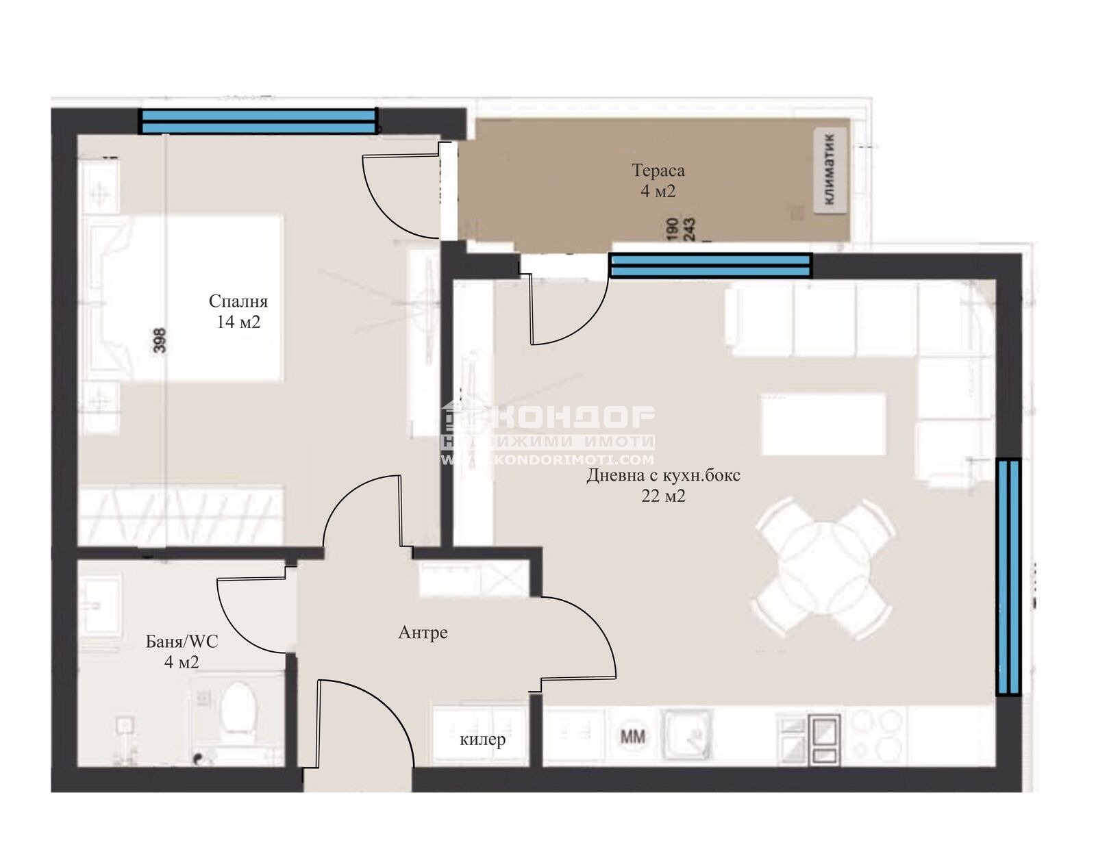 Оферта 63403: Предлагаме ви просторен 2 -Стаен апартамент в бутиков затворен жилищен комплекс с модерна и устойчива архитектура, разположен в една от най - предпочитаните и озеленени зони на квартала, предлагаща на живущите комфорт и спокойствие. Жилището се състои от дневна - 23 кв.м. с трапезария и кухненски бокс, една самостоятелна и функционална спалня 14кв.м., баня с тоалетна, килер с опция за перално помещение, широко антре и една разкошна обща тераса. Комплекса предлага просторна спокойна среда с бърз достъп до центъра на града, както и възлови булеварди, предвидено е облагородено дворно място между сградите, пейки за отдих, детски площадки за игра и стрийт фитнес. В близост са ситуирани множество Магазини , Здравно Заведение, училища и детски градини. При проектирането е заложено на материали от висок клас и е обърнато внимание на всеки детайл, като апартаментите ще бъдат издадени на: Стени и тавани гипсова мазилка, Под - циментова замазка; Под в санитарни помещение циментова замазка; Стени в санитарни помещения вароциментова мазилка, Тераси /под/ - мразоустойчив гранитогрес. Входни врати на апартаменти блиндирани, бързи хидравлични асансьори , ПВЦ дограма с троен стъклопакет. Паркирането е осигурено на 100% посредством подземни и надземни паркоместа и гаражи. Допълнителна екстра е заложеното в проекта окабеляване за зарядни станции за електрически автомобили при подземните Паркоместа . Възможност за разсрочено плащане или закупуване чрез Банков кредит !!!ВИЖТЕ ОЩЕ ИЗГОДНИ ОФЕРТИ НА https://www.kondorimoti.com/ С ЕЖЕДНЕВНА АКТУАЛИЗАЦИЯ!