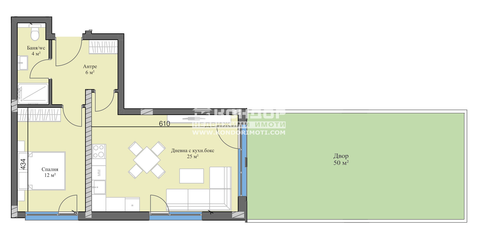 Разпределения - Просторни и много функционални апартаменти с просторни стаи и гледка към Стара планина, а също и с партерни жилища с двор и такива с големи панорамни тераси. Апартаментът, който Ви предлагаме се състои от дневна с кухненски бокс 25кв.м., самостоятелна спалня 12кв.м., баня с тоалетна, входно антре с място за гардероб и собствен двор от 50кв.м.