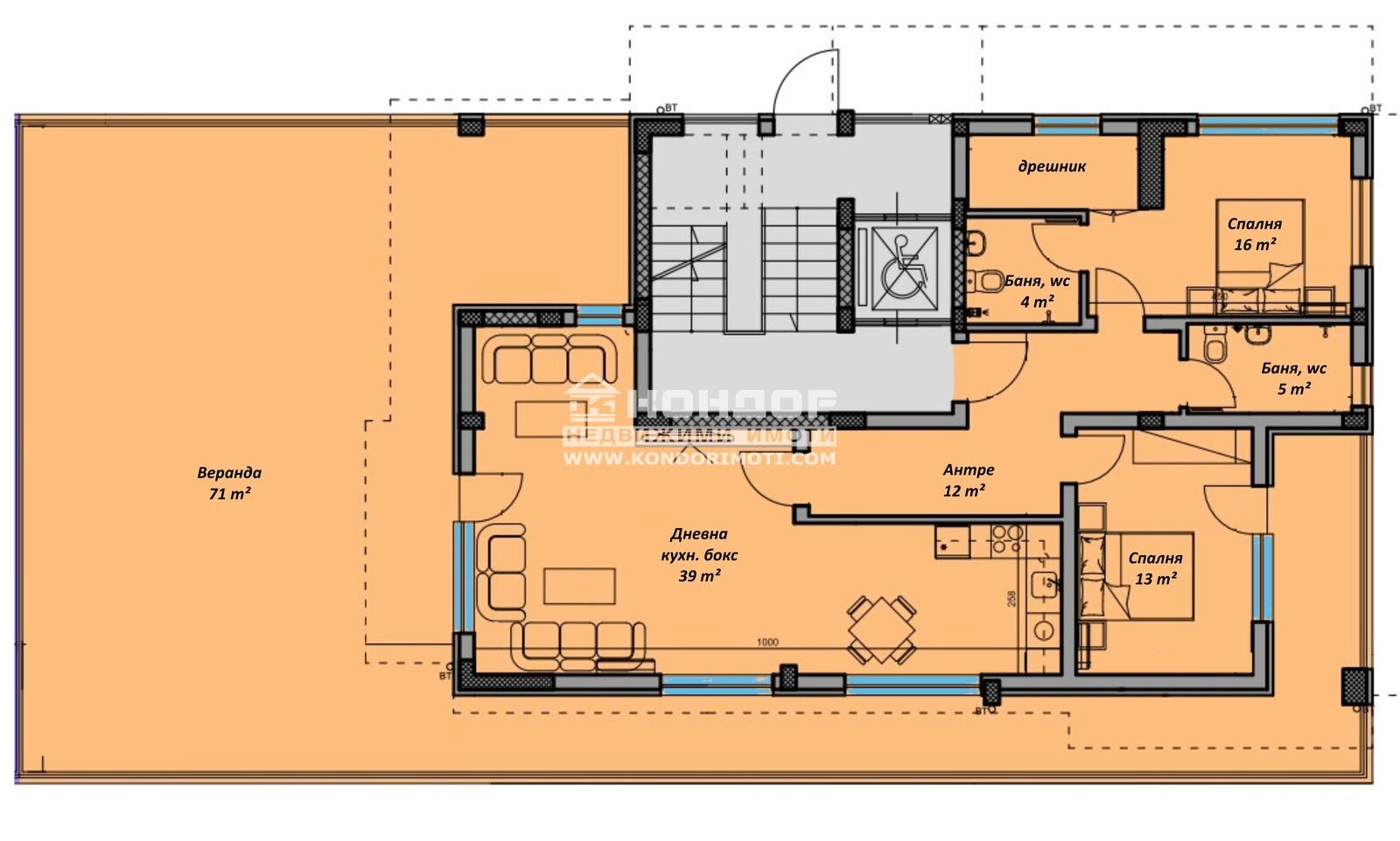 Разпределение: Апартаментът се състои от просторна ъглова дневна 40кв.м. с кухненски бокс и трапезария, две самостоятелни спални: родителска 12кв.м. със собствена баня и дрешник, детска 13кв.м., втора баня с тоалетна, широко входно антре и веранда с достъп от всички стаи.