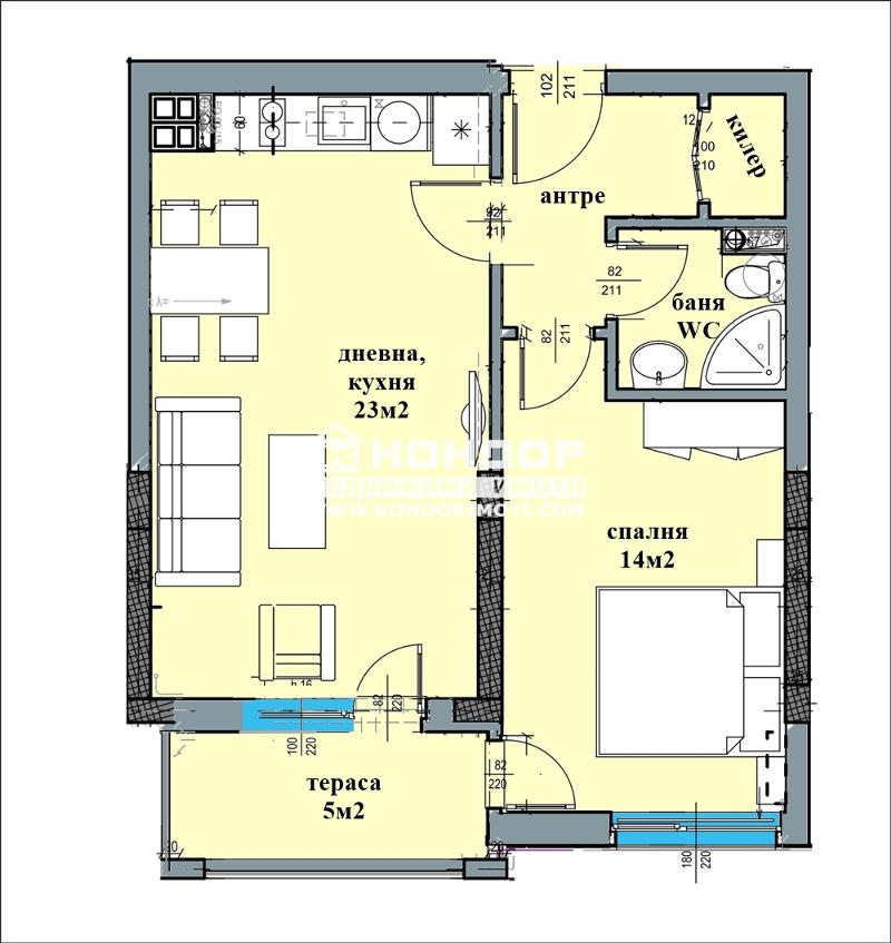 Оферта 57935: Имаме удоволствието да Ви предложим за продажба двустаен апартамент в нова луксозна бутикова сграда, уникална спрямо своята локация. Имотът е проектиран така, че да създаде максимален комфорт на експлоатация с удобни и просторни помещения и стаи, съчетани със страхотна панорама. Състои се от дневна с трапезария и кухненски бокс, самостоятелна спалня, баня с тоалетна, входно антре, килер и една тераса. Сградата е разположена на уникално място в близост до училище, детска градина, удобен транспорт и спортен комплекс със зелени площи и алеи за разходка, даващи възможност семейството да прекарва повече време заедно. Кооперацията е с малък брой апартаменти на етаж, като се строи от реномирана фирма с множество готови сгради в града. Жилищата се завършват според всички изисквания за качествено строителство с луксозни общи части: хидравличен асансьор, масивни блиндирани входни врати, шест камерна PVC дограма, Австрийски червени тухли Винербергер - Porotherm.ВИЖТЕ ОЩЕ ИЗГОДНИ ОФЕРТИ НА https://www.kondorimoti.com/ С ЕЖЕДНЕВНА АКТУАЛИЗАЦИЯ!