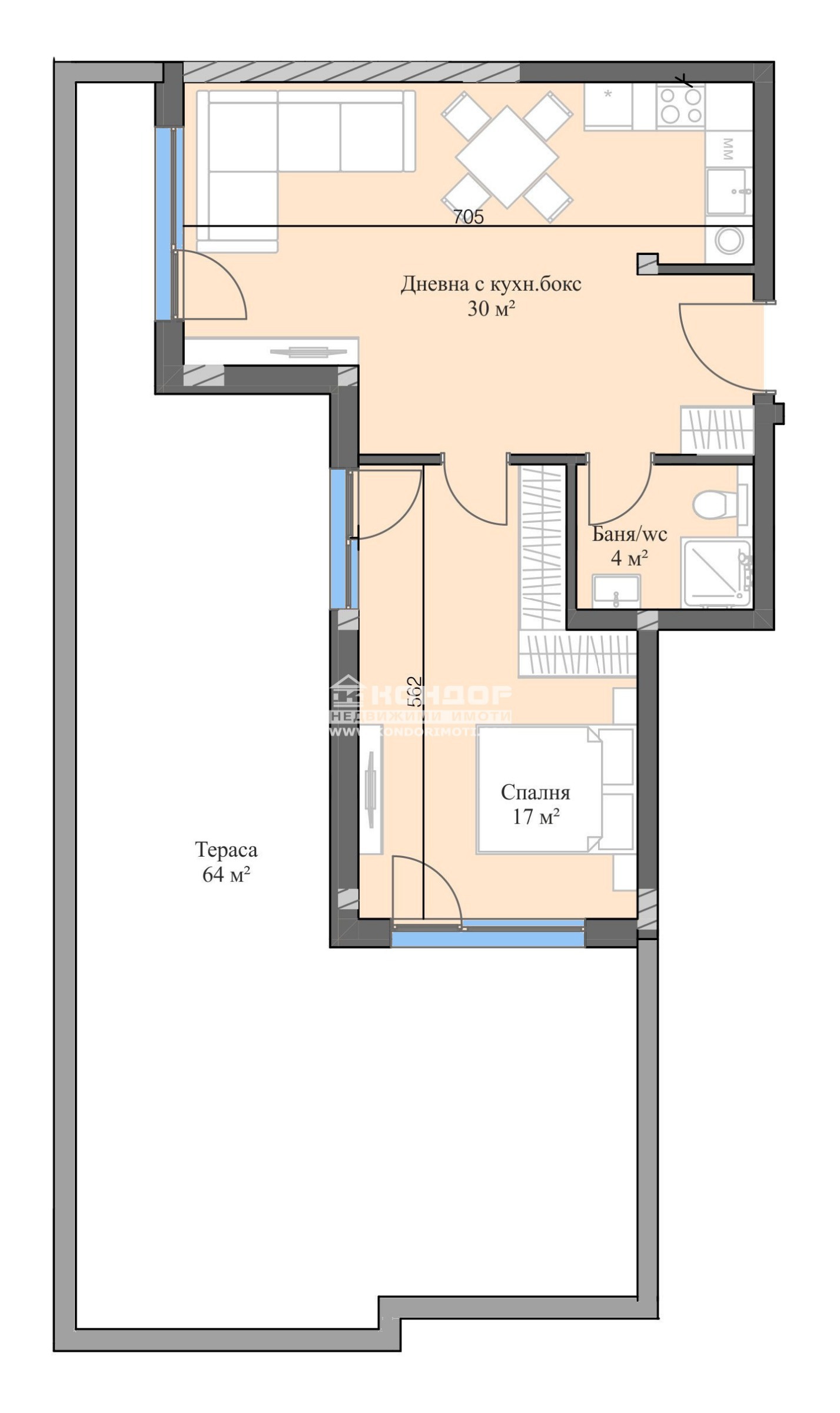 Разпределения - Просторни и много функционални апартаменти с просторни стаи и гледка към Стара планина, а също и с партерни жилища с двор и такива с големи панорамни тераси. Апартаментът, който Ви предлагаме се състои от дневна 30кв.м. с кухненски бокс и трапезария и излаз на панорамна тераса 64кв.м. с достъп от двете стаи, една голяма спалня 17кв.м., баня с тоалетна и входно антре.