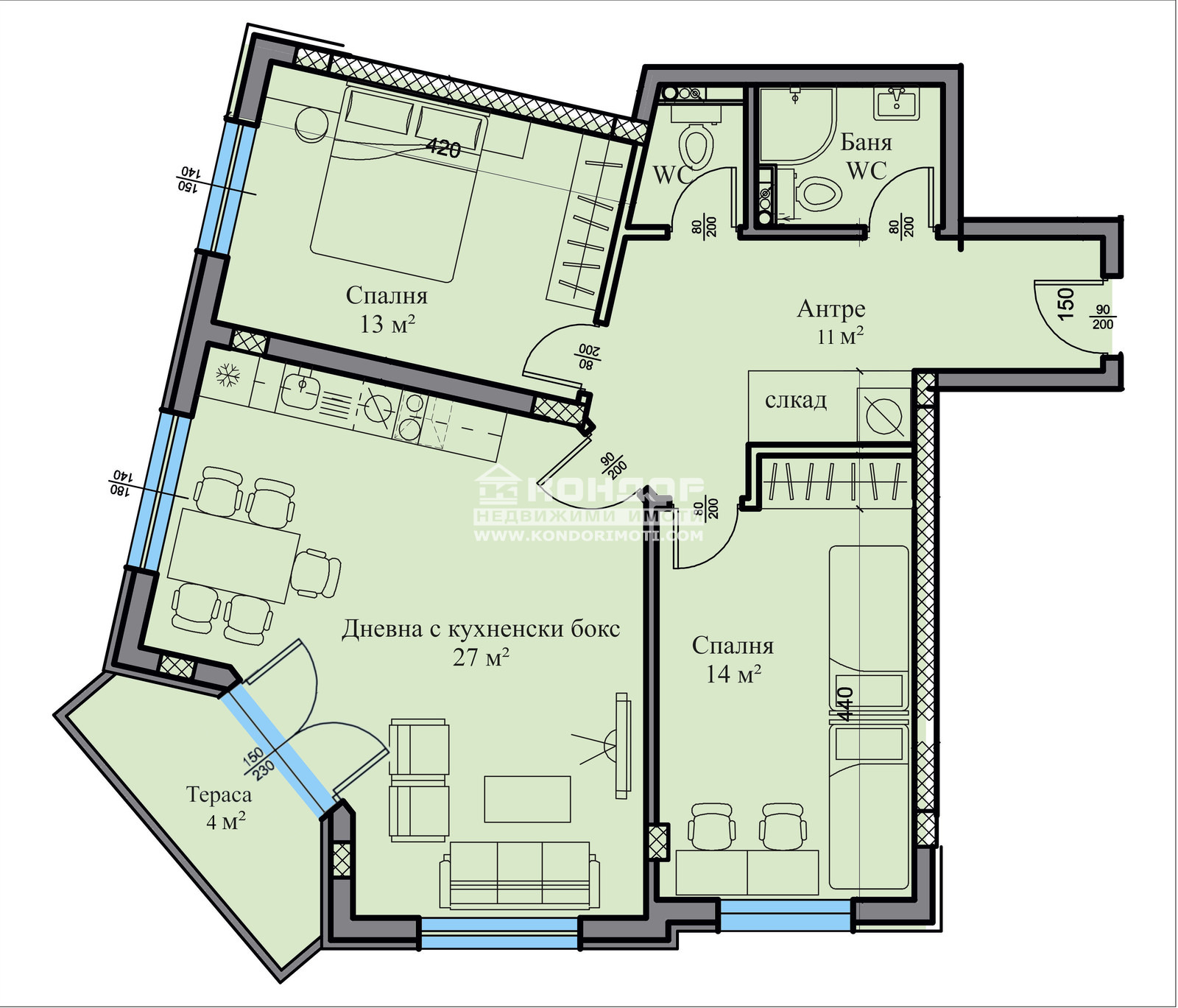 РАЗПРЕДЕЛЕНИЯ: Просторен тристаен апартамент с ъглов обширен хол 27кв.м. юг/изток с три големи френски прозореца, светла южна трапезария и кухня, две самостоятелни спални: голяма родителска 14кв.м. и детска 13кв.м., две санитарни помещения, перално, входно антре и една чудесна тераса допълва облика на това модерно бижу. Високите прозорци осигуряват изобилие от естествена светлина в отлично разпределеното жилищно пространство.