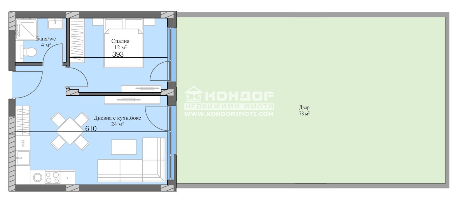 Разпределения - Просторни и много функционални апартаменти с просторни стаи и гледка към Стара планина, а също и с партерни жилища с двор и такива с големи панорамни тераси. Апартаментът, който Ви предлагаме е с ИЗЦЯЛО ИЗТОЧНО ИЗЛОЖЕНИЕ и се състои от дневна с кухненски бокс 24кв.м., самостоятелна спалня 12кв.м., баня с тоалетна, входно антре с място за гардероб и собствен двор от 78кв.м.