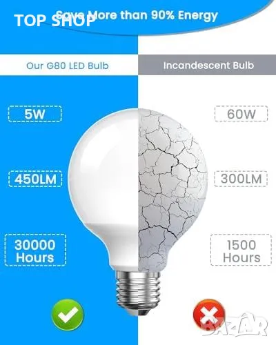 Нови 8 броя E27 LED 5W Глобус Крушка, 5000K, Енергоспестяваща, Не Мига