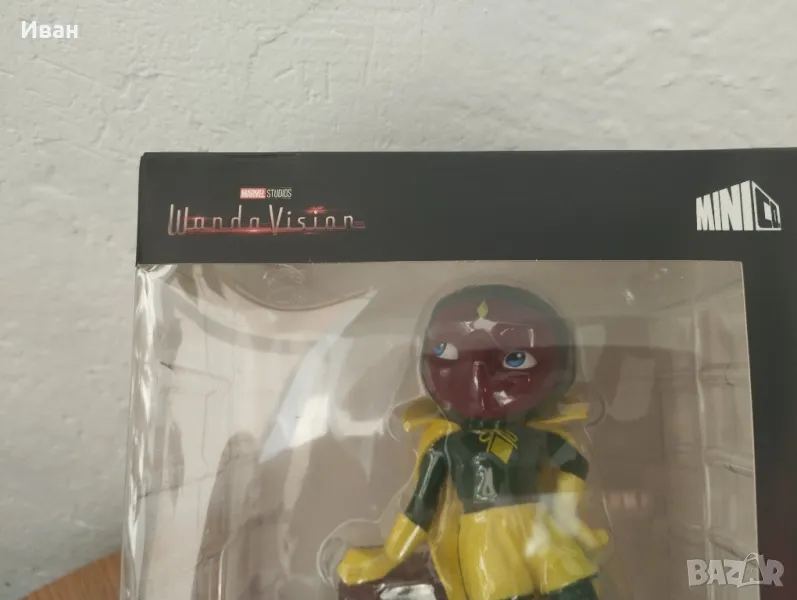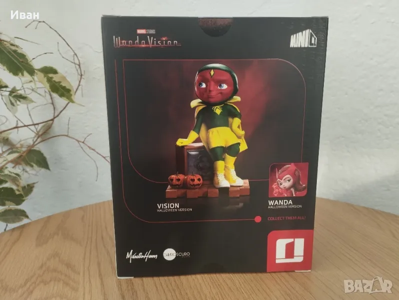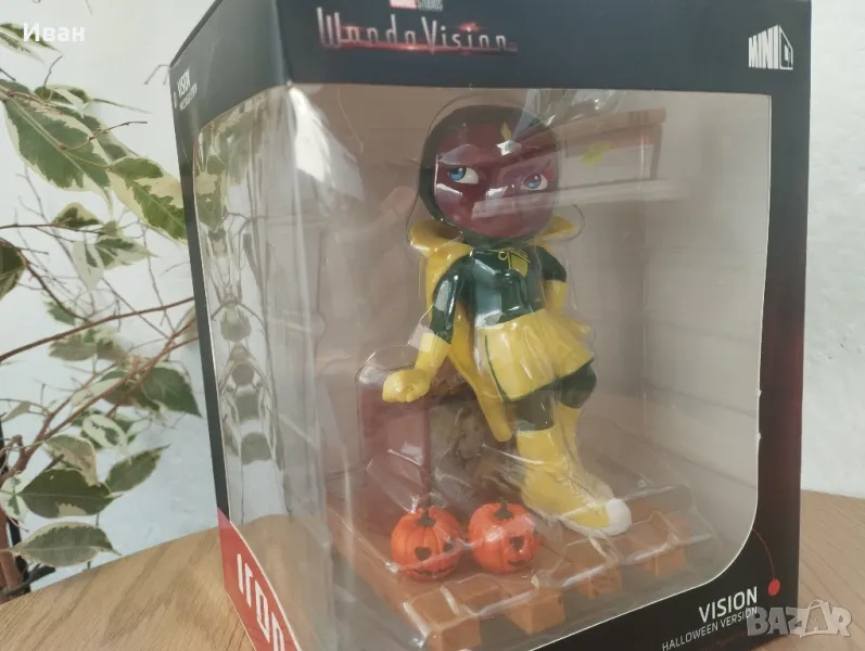 Небрежно усмихнатият Вижън е тук за вас под формата на тази страхотна статуетка от компанията Iron Studios. Преобразен за Хелоуин с многоцветен костюм, той се представя на Уанда като мексикански борец. Вижън е облегнат на старинен телевизор, чийто екран показва образа на любимата му жена Уанда, облечена в класическа рокля като герой от стар сериал. Героят притежава синтетично тяло, което е създадено с помощта на мощен артефакт, известен като Камъка на ума. Като Отмъстител той многократно е доказал, че силата му може да се мери само с тази на Капитан Америка.