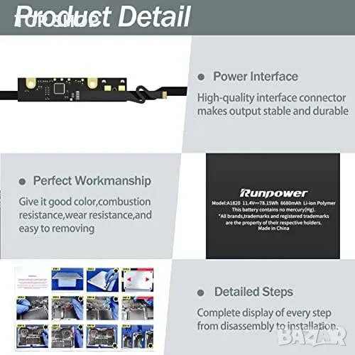 Литиево-полимерна батерия с напрежение 11,41 V/76,15 WH и капацитет 6680 mAh.