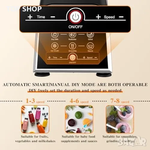 Многофункционален: 8 предварително зададени програми - като за кубчета лед, смутита, мляко от соя, сосове и други.
