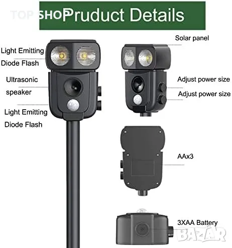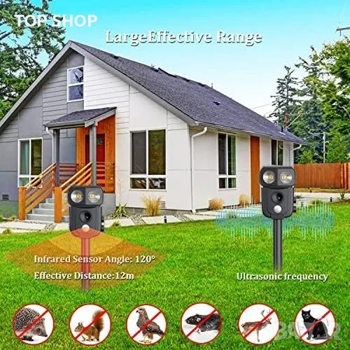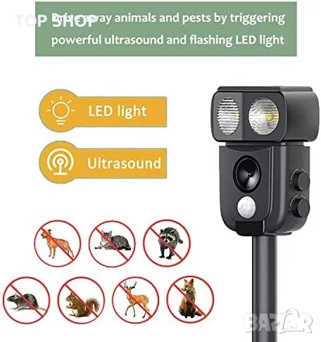 Ултразвуков Изгонващ Уред за Животни: Работи с ултразвук и светлинен сигнал, отблъсква кучета, котки, диви свине и други.