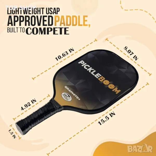 Ракетата разполага с издръжлива сърцевина от полипропилен тип пчелна пита, съчетана със здрава повърхност от въглеродни влакна, което я прави идеална както за начинаещи, така и за напреднали играчи. Ергономичната й дръжка гарантира, че можете да играете удобно, намалявайки умората на ръцете и подобрявайки контрола върху всеки изстрел. С елегантен калъф с цип, което гарантира, че вашата ракета остава защитена от прах и драскотини, когато не сте на корта. Комплект PickleBoom, с атрактивната си опаковка, е идеален подарък за всички любители на спорта.