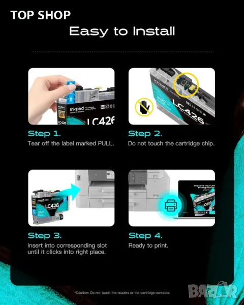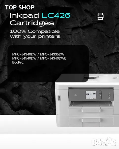 Касетите с мастило iNKPAD LC426 са проектирани за висока съвместимост с набор от принтери на Brother, включително модели MFC-J4335DW, MFC-J4340DW, MFC-J4535DW и MFC-J4540DW, оборудвани с най-новите подобрени чипове. Този пакет от 4 включва по една черна, циан, магента и жълта касета. Черната касета осигурява висок капацитет от 3000 страници, докато всяка цветна касета осигурява до 1500 страници при 5% покритие на хартия A4. Произведени от фабрика, сертифицирана по ISO 9001, ISO 14001, CE и ROHS, тези касети гарантират над 20 години специализиран производствен опит в производството на съвместими мастила.