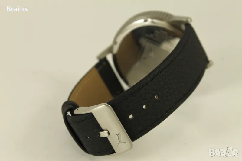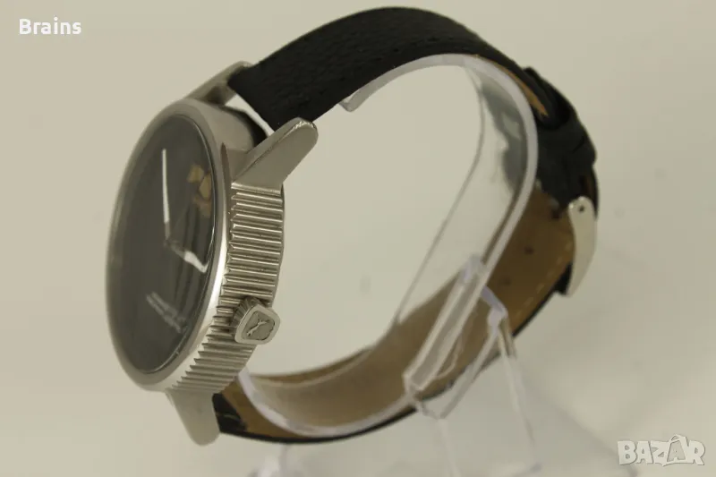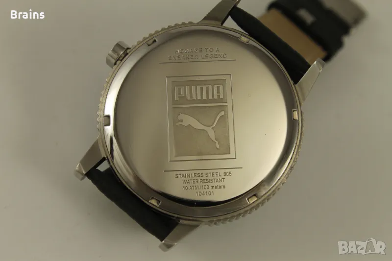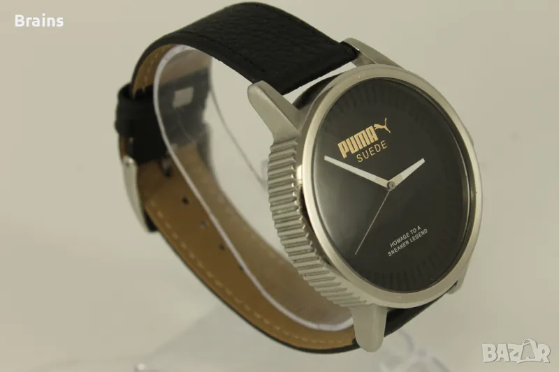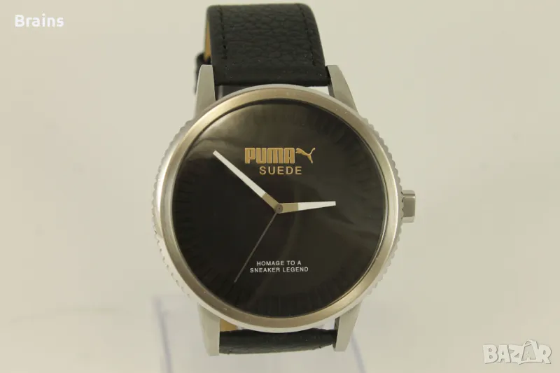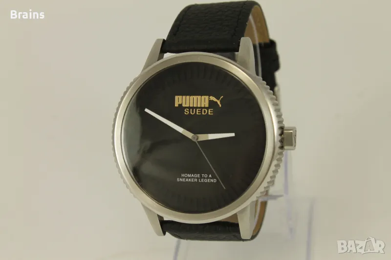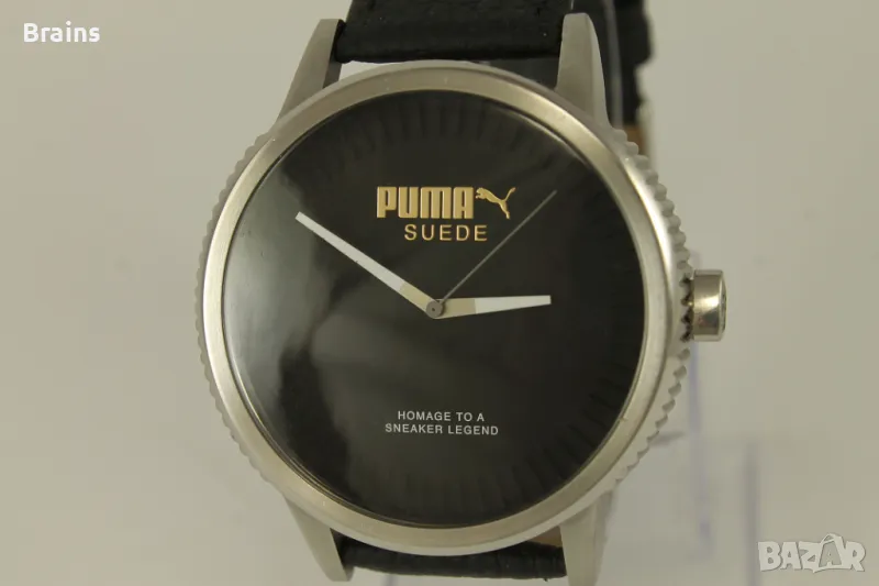 Мъжки ръчен кварцов часовник PUMA Suede. Изработен от висококачествена неръждаема стомана 805. 100 метра водоустойчив. Японски кварцов механизъм. Коронка със логото на PUMA. Часовника работи точно. В отлично визуално състояние.