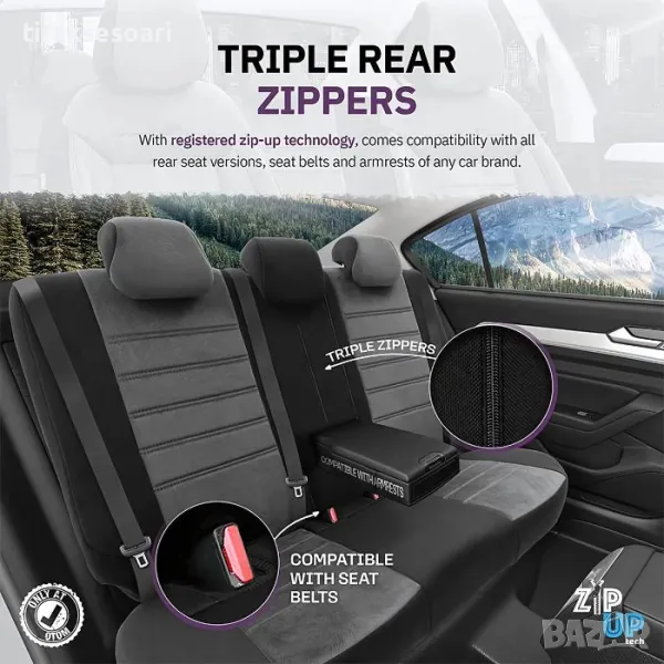 7-слоен ортопедичен дизайн осигурява опора за гърба и ви обгръща в седалката за по-комфортно шофиране. С многофункционален дизайн на седалката и технология за закопчаване с цип, тя става съвместима с всички версии на задни седалки, предпазни колани и подлакътници на всяка марка автомобили.
