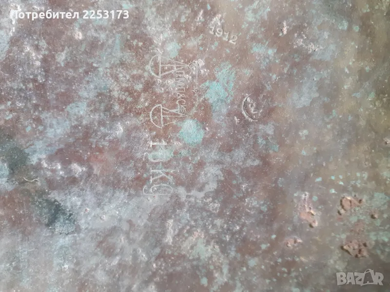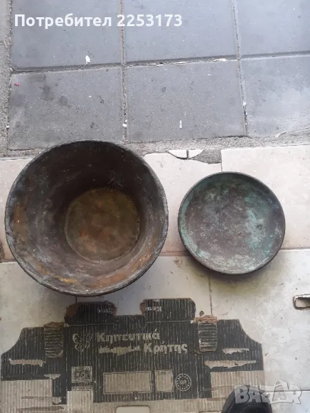 Имат патина и спукване на големия.Общо 1300гр.Двата не са еднакви по тегло.Малкия има царски маркировка 1912г. За допълване на стар кантар,ползване по отделно за декор и др.м.то.