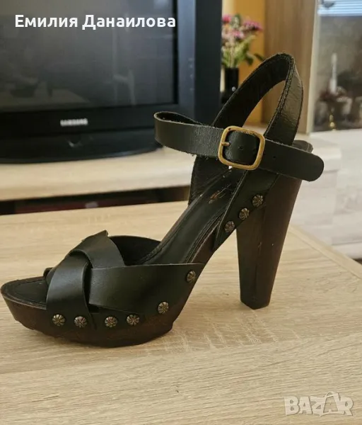 Испански дамски сандали, оцувани са само веднъж. Много удобни без забележки,но възрастта не ми позволява да нося толкова високи обувки и затова ги продавам. Височина на тока е 11 см.,дължина на ходилото 24 см.