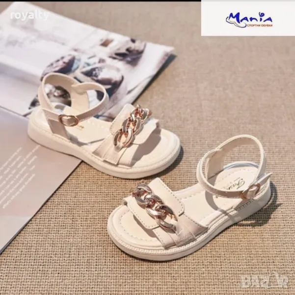 Детски лачени сандали.Горната част е от еко кожа,украсени със златиста верижка,подметката е мека и гъвкава,затварянето е с лепенка.