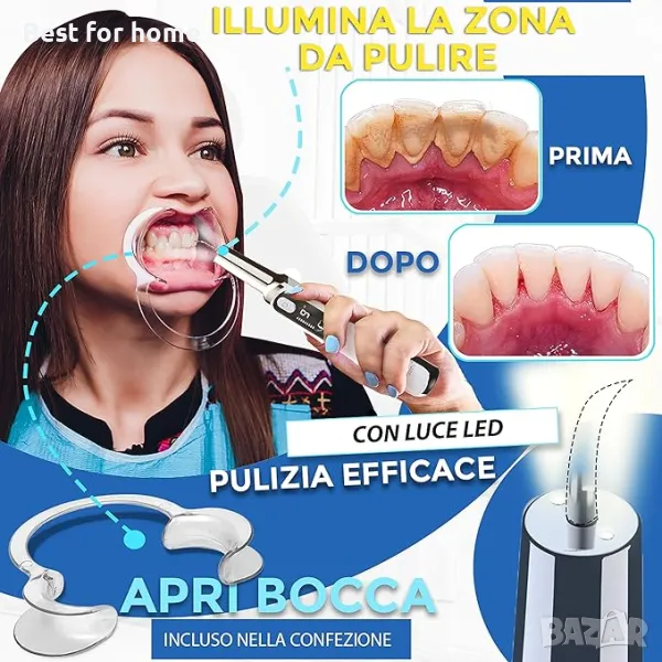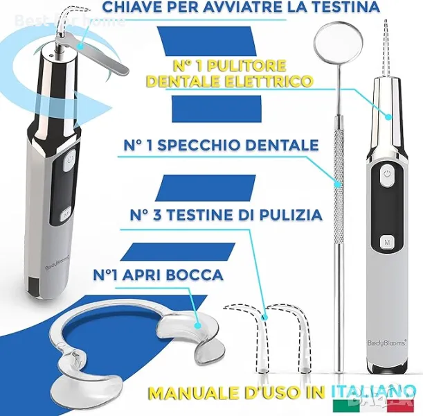 [ АКСЕСОАРИ ] : Ще получите електрическа четка за премахване на зъбен камък, 1 орален дилататор за устата (много удобен за почистване на зъбите), 1 зъболекарско огледало (стоматологично огледало за уста), 3 сменяеми глави (уред за почистване на зъби) за ефективно почистване на устата. Ще получите също ръководство с инструкции на италиански език и 80 cm USB C кабел, за да презаредите най-добрия си съюзник за вашата орална хигиена. Подходящ е и за грижа за зъбите на кучета/котки.