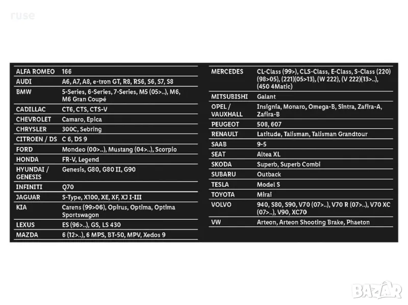 *Списъкът на моделите автомобили не е изчерпателен!