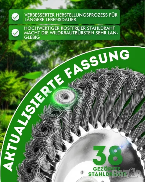 * Подобрена версия: Приемане на по-дебели и по-дълги висококачествени стоманени жици, допълнителни отвори за закрепване в средата на телената четка и допълнителни накрайници за закрепване на стоманени жици между всяка стоманена жица. Двойната технология на уплътняване прави четката за плевели по-издръжлива на износване, тъй като същия тип 38 плетени стоманени жици е по икономичен и практичен.