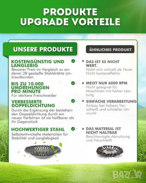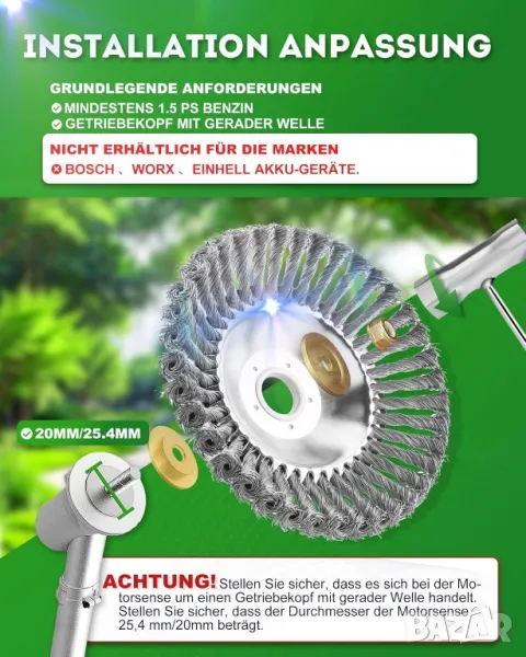 * Универсална четка за плевели: четката за плевели е подходяща за бензинови храсторези с мощност от 1,5 к.с. Трябва да има стандартни 25,4 мм (1 инч) или 20 мм връзки. Например за Husqvarna, Dolmar, Forester, Iseki, Echo AL-KO, Schauppach, Fuxtec и др. Не са подходящи за електрически тримери.