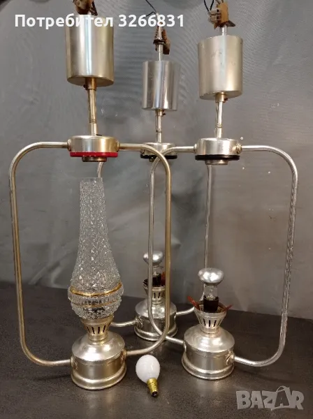 три броя унгарски осветителни тела за таван, изцяло алуминиева изработка, всичко е от алуминий, само един стъклен абажур имитиращ стъкло на газена ламба , изобщо целия вид на полюлея повтаря формата на газов фенер, крушките са миньонки , възможен бартер за стари ретро мотоциклети или части за тях с доплащане