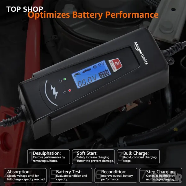 Amazon Basics 2A/4A Автоматично смарт 6V/12V зарядно устройство за батерии с функция за тестване