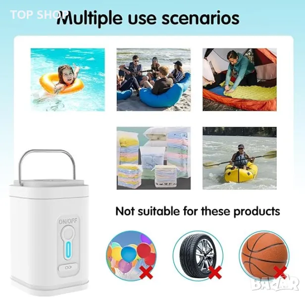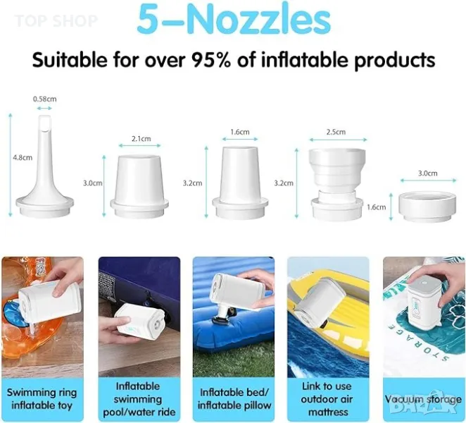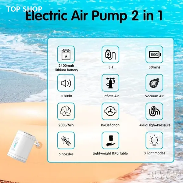 Тази електрическа въздушна помпа 2 в 1 предлага както надуване, така и засмукване, осигурявайки стабилно налягане от 4000 Pa и обем на въздуха от 200 l/min, като надува двойно въздушно легло само за 5 минути. С вградена акумулаторна литиева батерия от 2500mAh, тя може да се зарежда удобно през USB и може да работи 30 минути след 3-часово зареждане. Преносима и безжична, тази компактна помпа е перфектна за употреба както на закрито, така и на открито, като плажни излети и къмпинги. Функциите за безопасност включват защита от прегряване и издръжлив ергономичен дизайн против падане и неплъзгане. Доставя се оборудвана с четири различни дюзи, отговарящи на различни нужди от надуване, от надуваеми дюшеци до плувни халки. Ефикасна и лесна за употреба, нейната работа генерира под 80 децибела шум, осигурявайки минимални смущения по време на употреба.