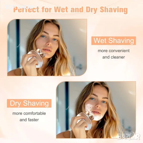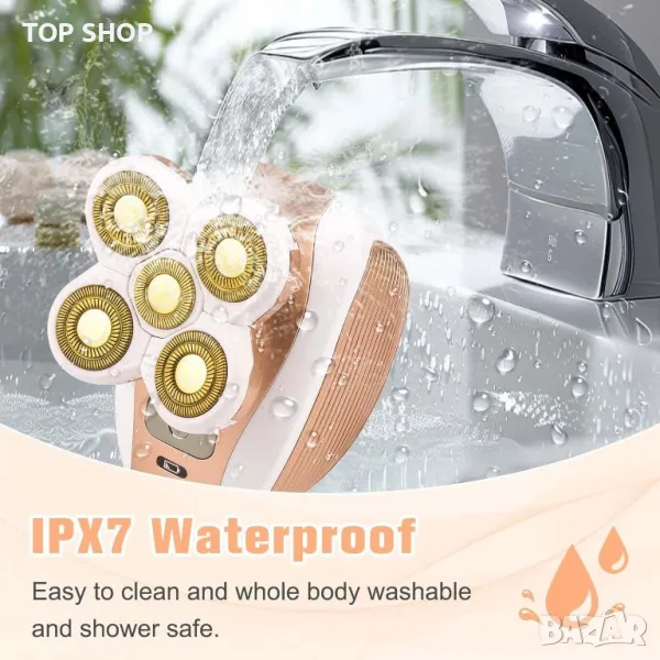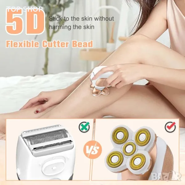 електрическа самобръсначка за жени разполага с пет взаимозаменяеми глави с 18K позлатено покритие, които плават, за да се адаптират към различни контури на тялото, включително крака, лице, устни, тяло, ръце и бикини зоната. Проектиран да бъде нежен към всички типове кожа, той осигурява безболезнено изживяване при премахване на косми без дразнене. Хипоалергенните остриета гарантират безопасност и са изработени така, че да предотвратяват директен контакт с кожата, като същевременно ефективно подрязват косата в корена. Самобръсначката е с ергономичен дизайн с удобен захват и прост бутон с едно натискане за лесна употреба. Той предлага дълъг живот на батерията с вградени LED светлини за показване на състоянието на зареждане, което позволява удобна безжична употреба след бързо зареждане от 1 до 2 часа. Тази компактна и лека самобръсначка е идеална както за дома, така и за пътуване, което я прави идеален подарък за жени.