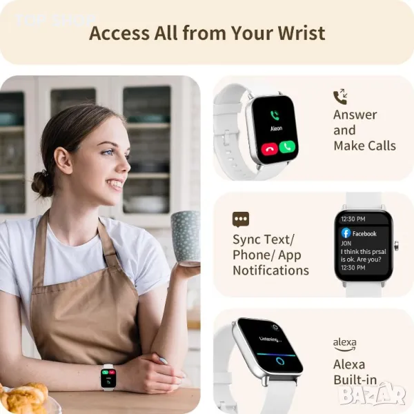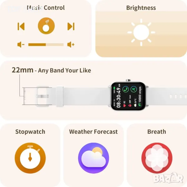 Смарт часовник, включващ вграден микрофон и Hi-Fi високоговорител за безпроблемно управление на разговори в движение. Поддържайте връзка със синхронизирани SMS и съобщения от приложения като WhatsApp и Facebook, докато интеграцията на Alexa позволява управление със свободни ръце за задачи като възпроизвеждане на музика, проверка на времето и аларми. Със 100 спортни режима и IP68 водоустойчивост, той е идеален за фитнес ентусиасти, предлагащ точно наблюдение на здравето, включително SpO2, сърдечен ритъм, стрес и анализ на съня. 1,8" HD сензорен екран осигурява жив дисплей, който може да се персонализира с до 100 циферблата. Насладете се на удължен живот на батерията, издържаща 5-7 дни, и изследвайте функции като управление на камерата, прогнози за времето и управление на музика. Съвместим с Android 6.0, iOS 9.0 и по-високи, това е най-добрият спътник за модерен начин на живот.