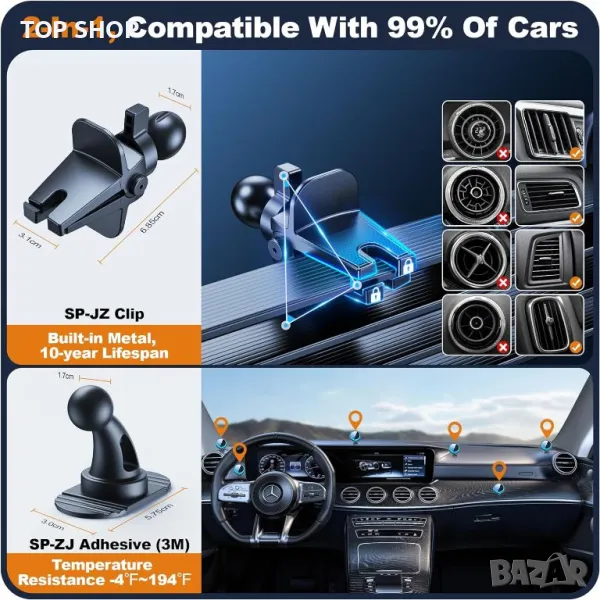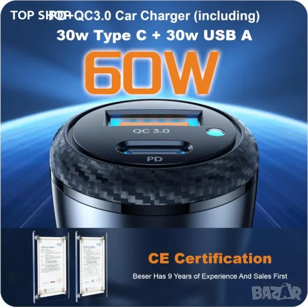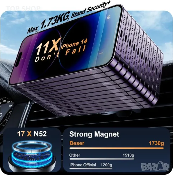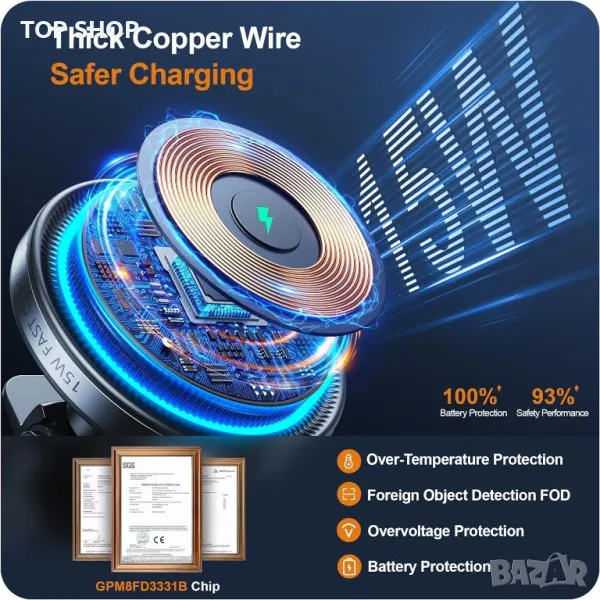 Адаптерът за зарядно за кола 60 W е съвместим със серия iPhone 15-12 и серия Samsung S22-S24. Включва адаптер за зарядно за кола за $16 и може да се използва на вентилационни отвори или табла. 9-то поколение подобрена скоба с вграден метал подобрява стабилността с 200% и удължава живота с 10 години. Снабден със 17 мощни магнита N55, той осигурява силен магнетизъм за предотвратяване на изпускане на телефона дори при условия извън пътя. Зарядното устройство поддържа 15 W безжично бързо зареждане с QI протокол, повишавайки скоростта с 96% и включвайки AI интелигентен чип за контрол на температурата за безопасност на батерията. Beser, топ 3 марка по качество на продуктите