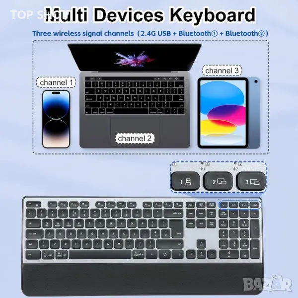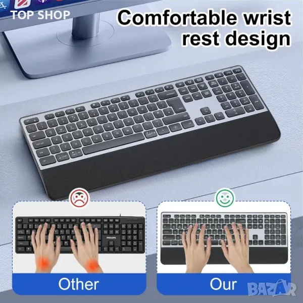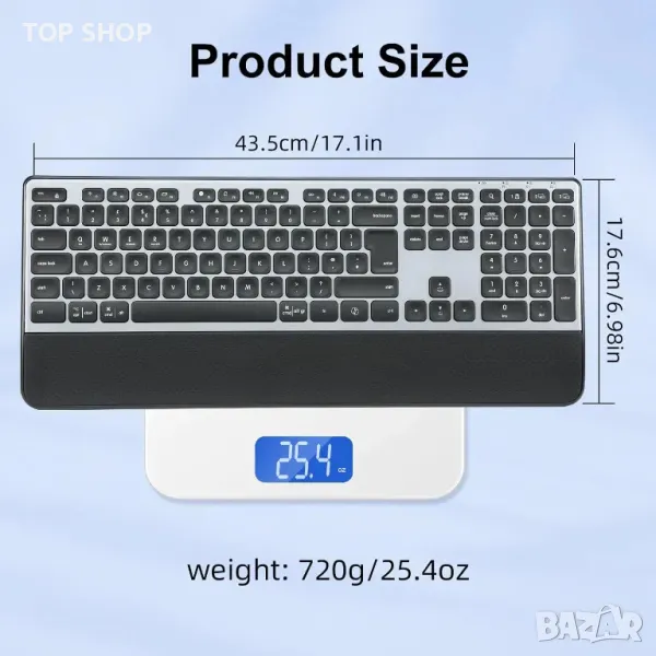 CITLLA K9100 Безжична Bluetooth клавиатура, Пълноразмерна с опора за китката, 3-степенна подсветка