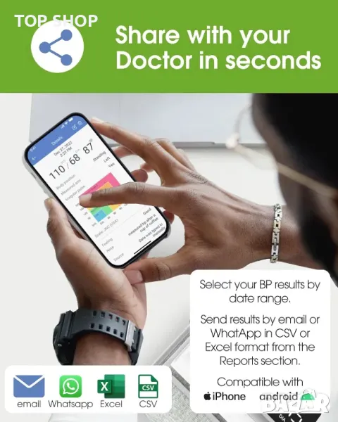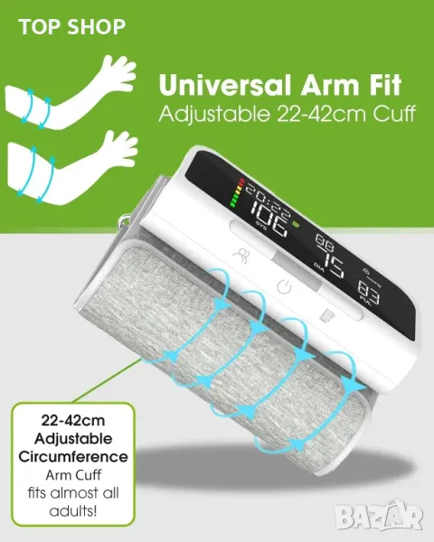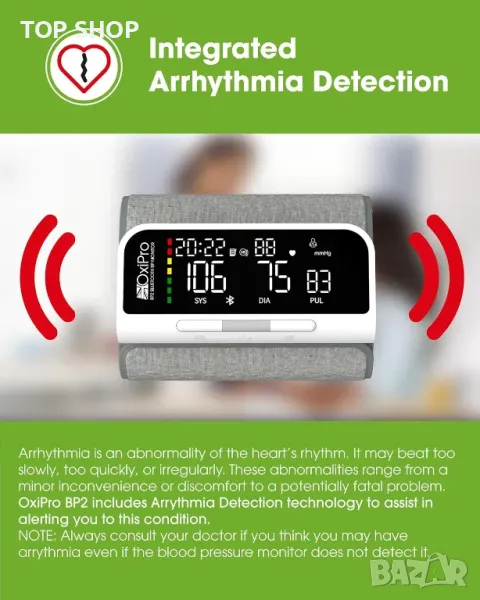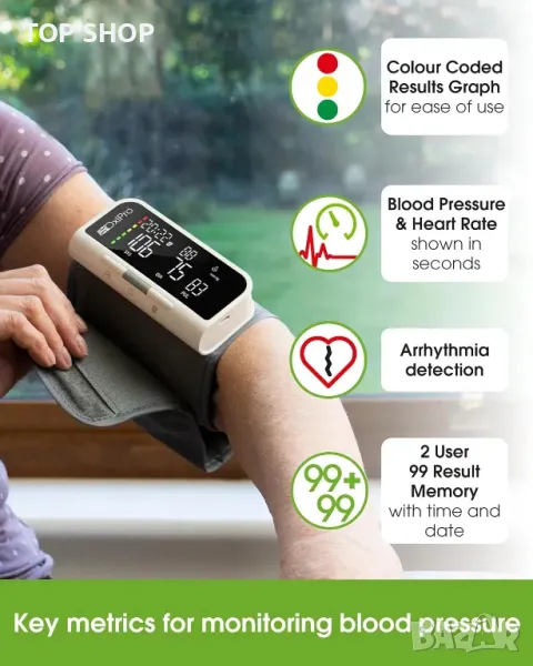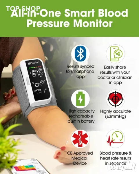 BP машината на OxiPro предлага безпроблемно Bluetooth синхронизиране с приложение за смартфон (съвместимо с Android и Apple iOS) за цялостно проследяване на здравето, включително време, дата и визуализация на тенденции. Позволява лесна комуникация с лекари чрез имейл, споделяне на подробни отчети с дата, час и бележки. Устройството предоставя прецизни показания за кръвно налягане и пулс с разделителна способност 1 mmHg и 1 bpm, сертифицирано като медицинско устройство от TUV Sud. Големият интуитивен дисплей включва цветно кодирана лентова графика за показване на ниски, нормални или високи нива на кръвно налягане, осигурявайки удобно за потребителя наблюдение.