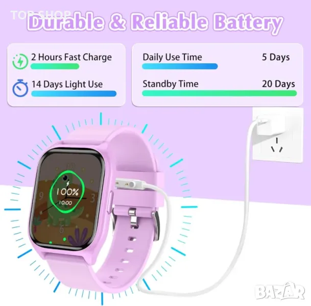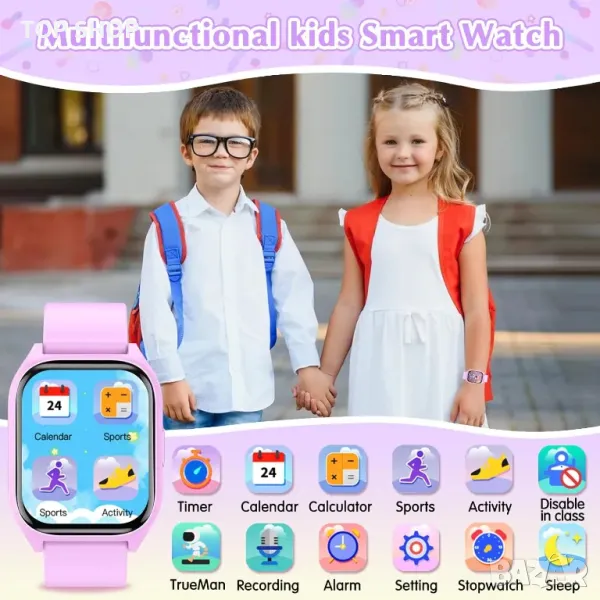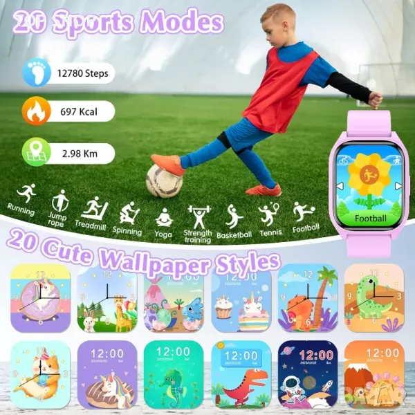 детски смарт часовник разполага с 14 увлекателни пъзел игри, предназначени да подобрят координацията око-ръка и критичното мислене, като същевременно осигуряват приятно забавление. С регулируема яркост предпазва очите на децата по време на употреба. Изработен от здрав, устойчив на износване калъф и нечуплива каишка, този многофункционален часовник включва камера, видео, музика, игри, запис, калкулатор, календар, будилник и персонализирани настройки, всичко това без необходимост от изтегляне на приложения. Той проследява стъпките, разстоянието и изгорените калории в 20 режима на активност, насърчавайки здравословните навици и интереса към спорта. Оборудван с вграден таймер, хронометър и календар, той помага на децата да управляват времето и да решават проблеми. Стилен и персонализиран с различни тапети, този смарт часовник е фантастичен подарък за рожден ден, празник или друг специален повод, подходящ както за момчета, така и за момичета.