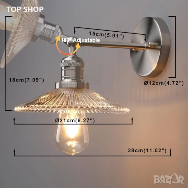 Тази универсална стенна лампа, изработена от метал с ръчно издухан прозрачен стъклен цилиндър, може да се монтира с лице нагоре или надолу. Той разполага с регулируем на 180 градуса светлинен абажур с 21 см (8,27") отвор и 12 см (4,7") диаметър на стенната плоча. Съвместим с винтови крушки E27, включително LED и крушки с нажежаема жичка (не са включени), той поддържа димерни превключватели с димируеми крушки. Идеален за кухненски острови, барове, хотелски ресторанти и кафенета.