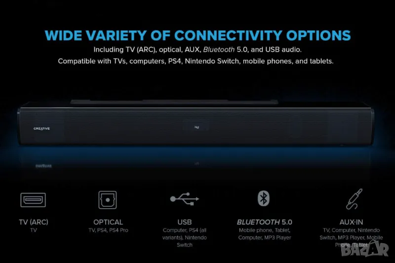 • Гъвкава свързаност – поддържа HDMI ARC, оптичен вход, USB, Bluetooth 5.0 и AUX, което осигурява лесно свързване към телевизори, компютри, конзоли и мобилни устройства.