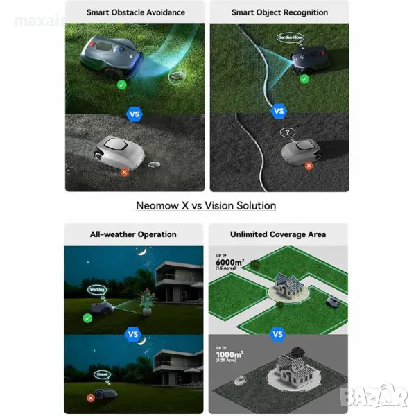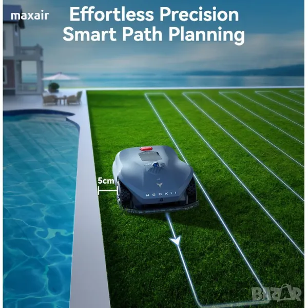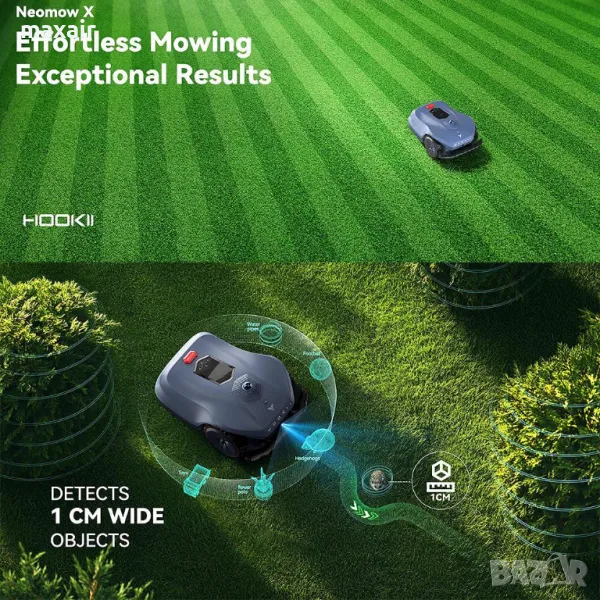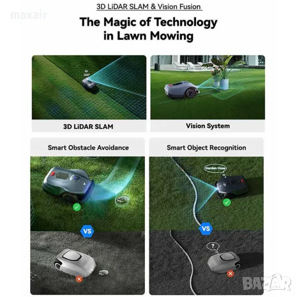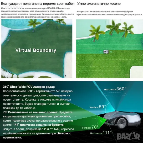 Функция Auto-Resume Mowing – връща се на зарядната станция, когато батерията падне до 20% и след зареждане продължава да коси от точката на прекъсване)