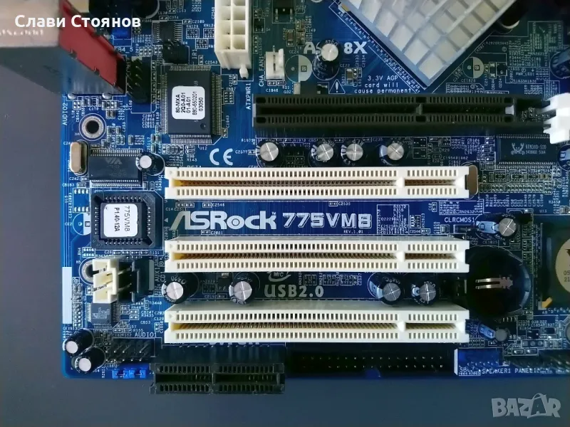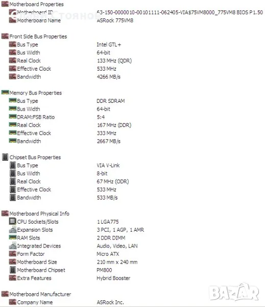 Asrock 775VM8(rev 1.01), Socket LGA 775, Chipset PM800/8237. В добро състояние, няма надути или изтекли кондензатори, няма изкривени или счупени пинове по сокета, всичко по платката работи(вградени видео,звукова и мрежова карти, usb портове, DIMM слотове, и т.н), сменена термопаста на радиаторa на северния мост на чипсета, сменена батерия на биоса. Дъното е с качена последна версия на биоса 1.50 (вижда се на снимките). Оригиналната метална задна планка (io shield) не е налична, като алтернатива предлагам 3D принтирана версия от PLA. При желание от ваша страна мога да я принтирам в черен, червен или сив цвят. Доставка със Спиди или Еконт, отстъпка 10% от цената на доставката. За София може лично предаване както и тест на място.