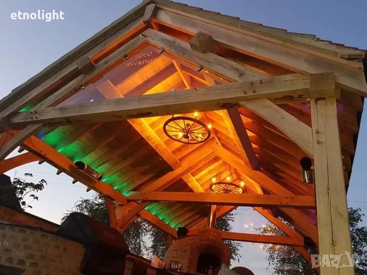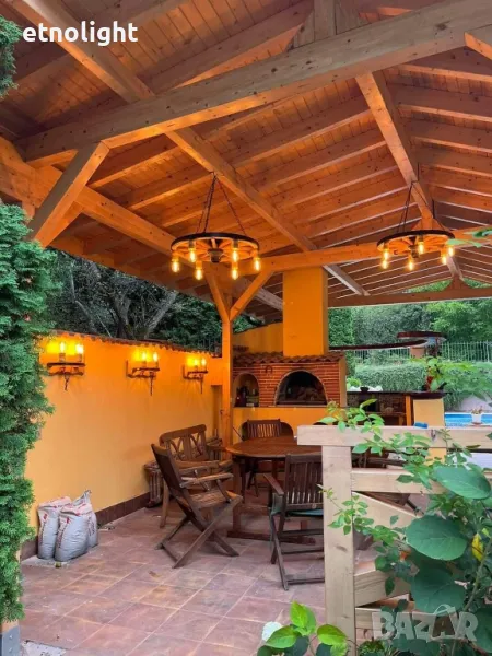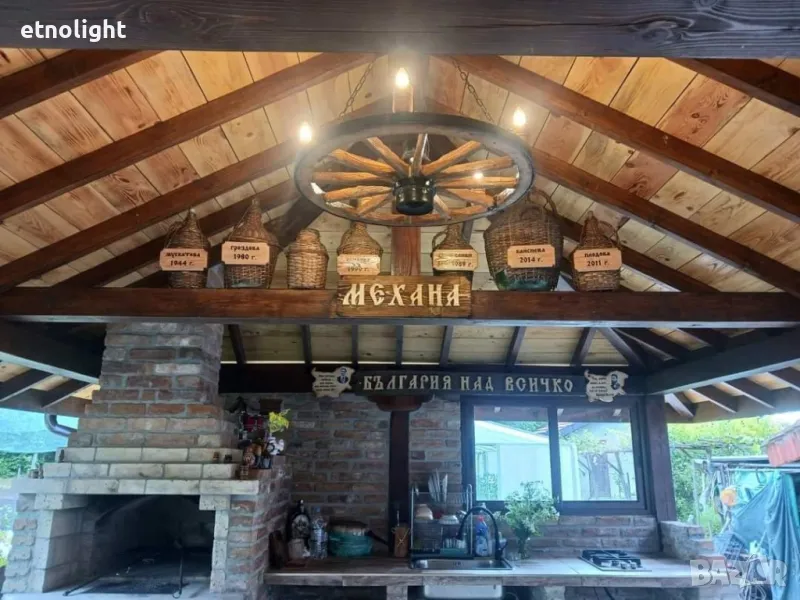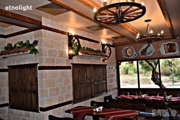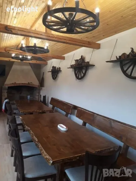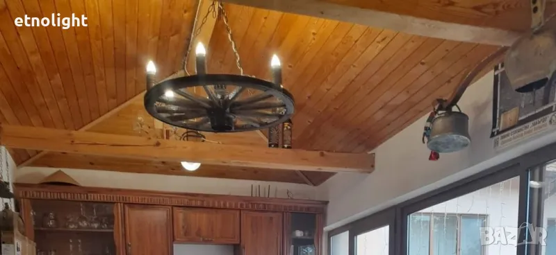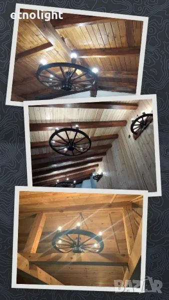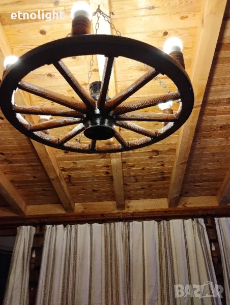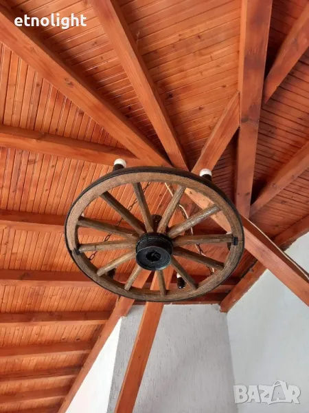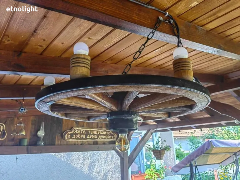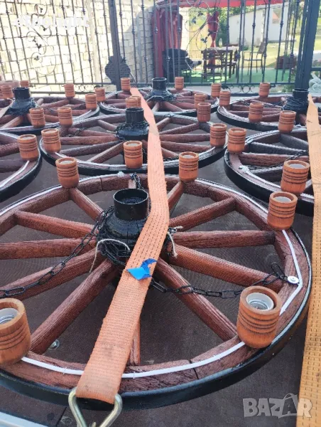 Полилеи, осветление от автентични реставрирани колела от каруца с ръчно изработени дървени чашки → Обява 49968867