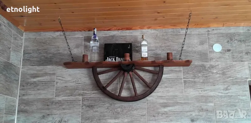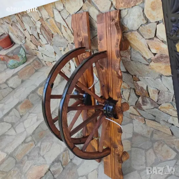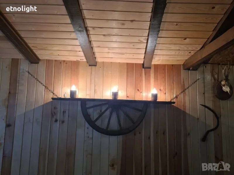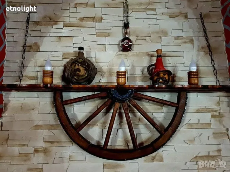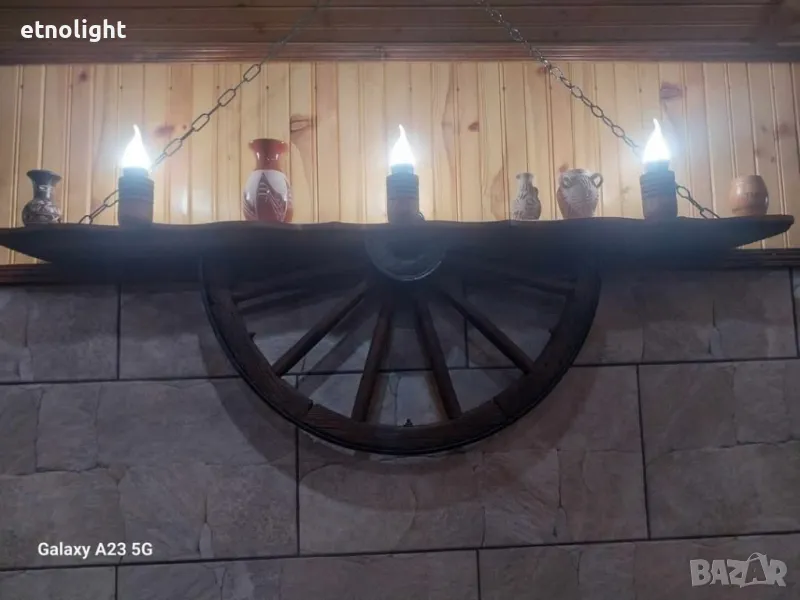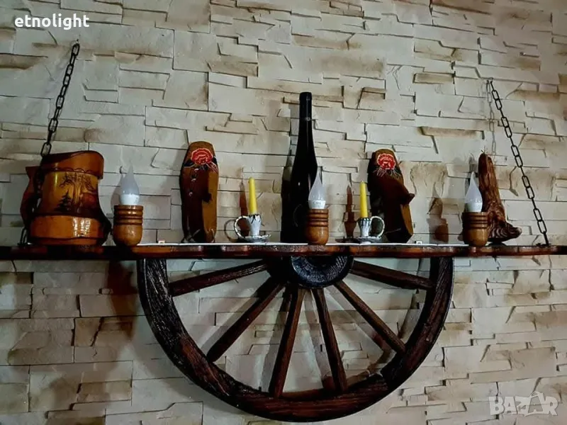Рафт лампи с автентични реставрирани колела от каруца с ръчно изработени дървени чашки → Обява 49968895