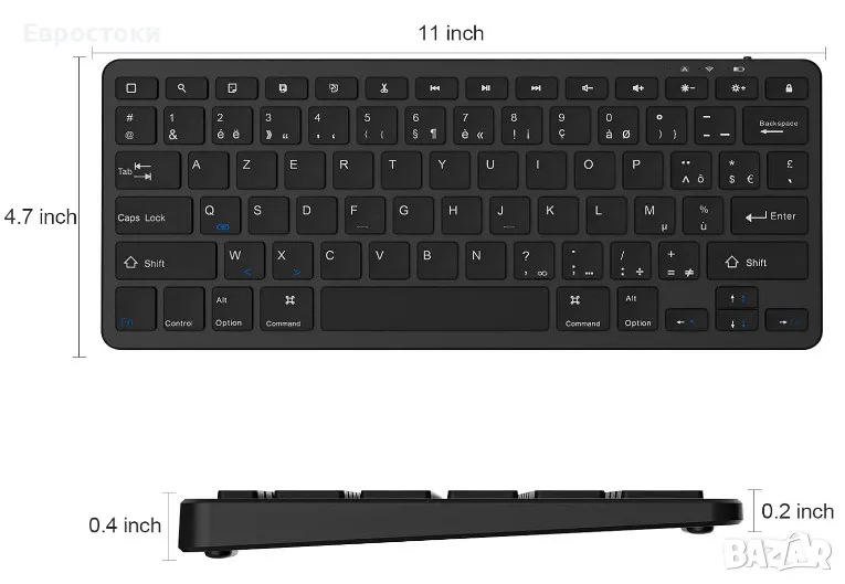 Тънка и преносима. Ултра тънка, лека, лесен за носене и съхранение. Изработена от ABS, клавиатурата е издръжлива и естетична. С 12 мултимедийни клавишни комбинации, Bluetooth клавиатурата ви дава незабавен достъп до любимите ви мултимедийни опции: музика, медии, интернет, имейл и др.