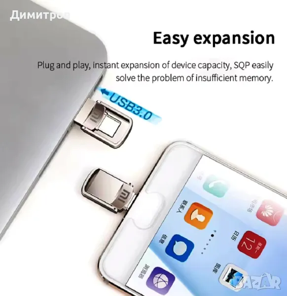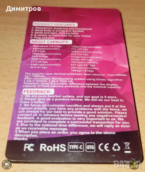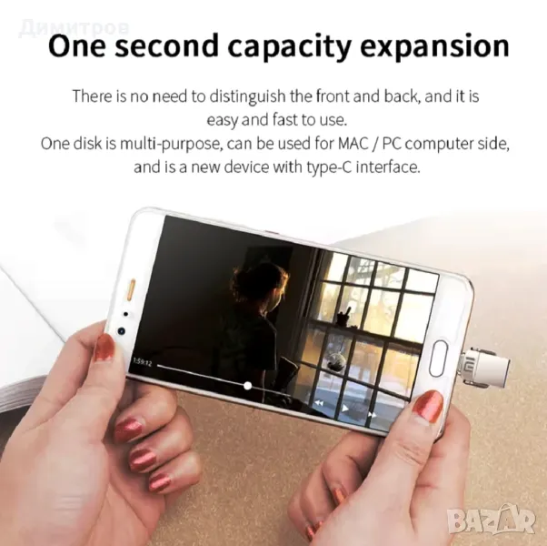 2в1- с два накрайника с USB- тип C 3.1 за телефон и стандартен USB-A 3.0 за всички други устройства с USB порт-телевизор, компютър, таблет...OTG - не е необходим адаптор, директно се включва в телефон. Подарък - Ключодържател.Водоустойчив и издръжлив тежи само 5 гр.