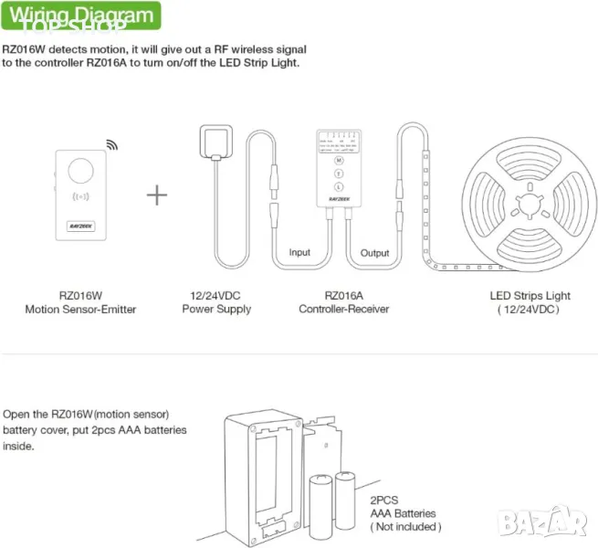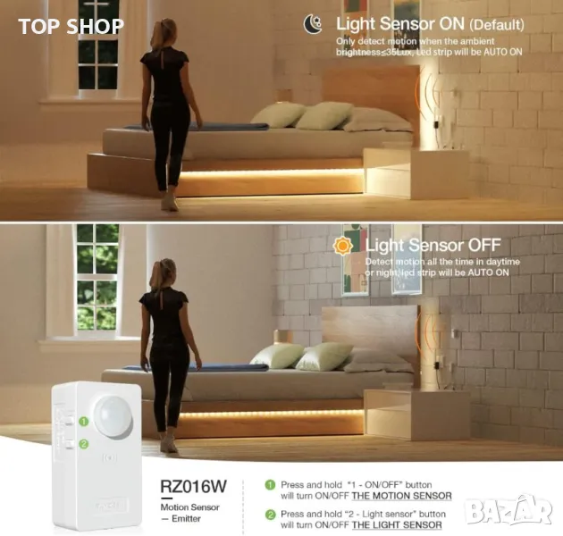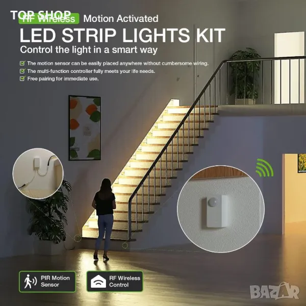 Този комплект включва безжичен PIR сензор за движение и RF контролер за автоматично управление на светлината на LED лентата при откриване на движение, елиминирайки необходимостта от окабеляване и опростявайки инсталацията. Предлага регулируеми настройки за забавяне (15s-900s) и нива на яркост (20%-100%), за да отговарят на вашето настроение. С три режима на работа (автоматично/включване/изключване) и два сензорни режима, той пести енергия, като открива движение само когато околната светлина е ≤35 LUX или работи непрекъснато. Комплектът използва безопасен захранващ адаптер, гарантиращ безопасност за деца и възрастни хора, със силен RF обхват на безжично предаване от 7-20 метра, подходящ за различни пространства като стълби, коридори, спални и шкафове.