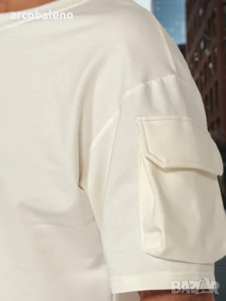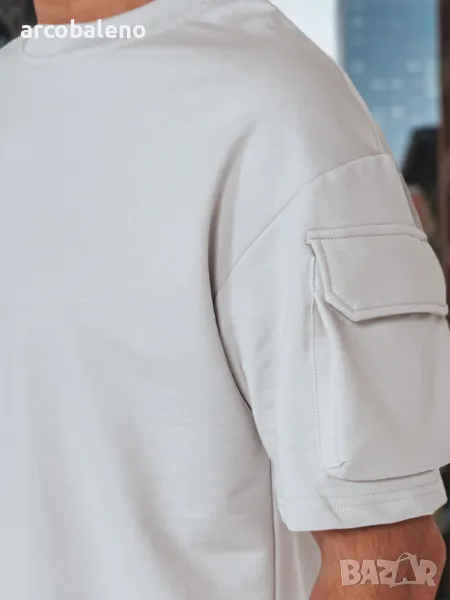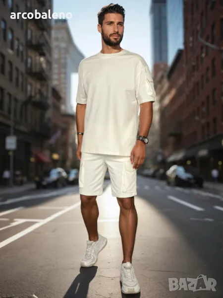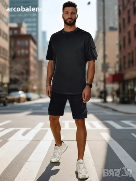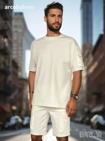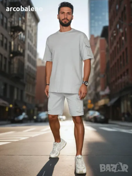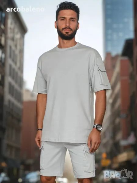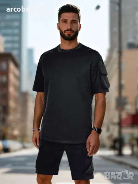 Мъжки комплект от две части, съчетаващ комфорт с модерен градски стил. Тениската с къс ръкав е с декоративен джоб на рамото, а карго панталоните са с четири джоба и ластичен колан с шнур за регулиране. Цялата е изработена от мека материя, идеална за пролетните и летни дни и ежедневието в града.