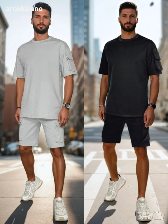 Мъжки комплект от две части, съчетаващ комфорт с модерен градски стил. Тениската с къс ръкав е с декоративен джоб на рамото, а карго панталоните са с четири джоба и ластичен колан с шнур за регулиране. Цялата е изработена от мека материя, идеална за пролетните и летни дни и ежедневието в града.