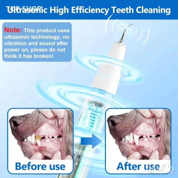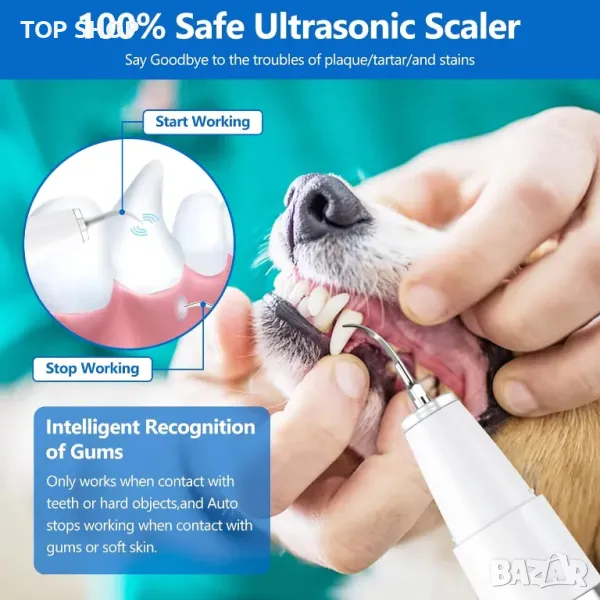 Най-новата интелигентна технология за премахване, ефективно и безопасно премахва плаката, зъбния камък от зъбите на домашни любимци без вреда. Устройството предлага пет режима на почистване, включително мек режим за начинаещи, и работи безболезнено, като се активира само при контакт със зъбите. Предлага се с професионален почистващ комплект, включващ четка за зъби, четка за пръсти, орално огледало и две сменяеми почистващи глави за цялостно почистване. Този комплект спестява време и енергия, като намалява необходимостта от чести посещения при зъболекар. USB акумулатор с мощна литиева батерия, зарежда се за 2-3 часа и е IPX6 водоустойчив за безопасна употреба.