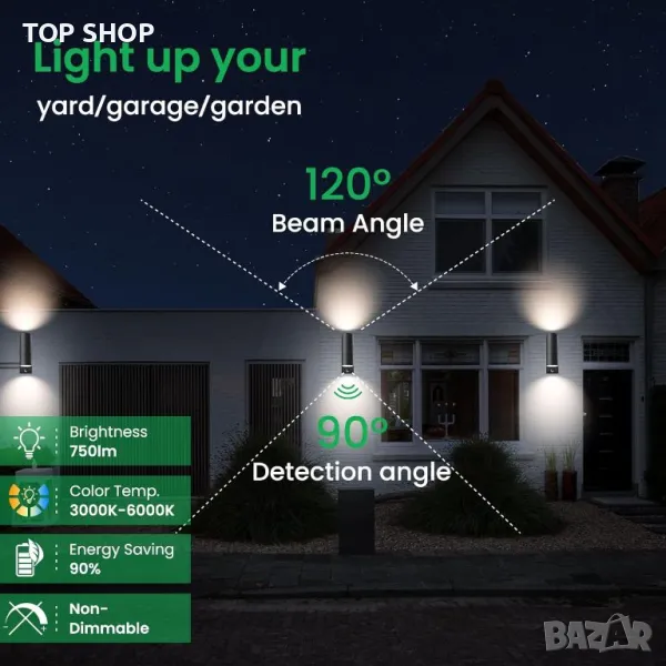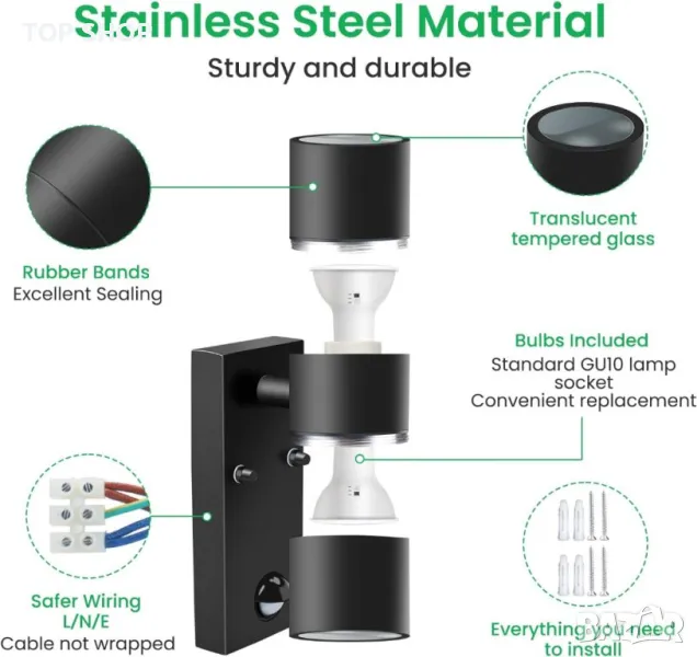 Тази LED GU10 стенна лампа разполага с две крушки, които отговарят на яркостта на 70W халогенни крушки, осигурявайки значителни икономии на енергия до 90% и светлинен поток от 750 лумена. Крушките могат да се похвалят с живот до 30 000 часа, свеждайки до минимум необходимостта от подмяна. Оборудвана с PIR сензор за движение, светлината предлага персонализирани настройки, включително откриване на движение до 8 метра, настройки на чувствителността за дневна или нощна употреба и променлива продължителност на осветяването от 5 секунди до 4 минути. Моделът разполага и с 3-цветна настройка на температурата (3000K, 4000K, 6000K), която се регулира чрез бутон, осигурявайки гъвкавост за различни среди. Изработен от издръжлива неръждаема стомана с водоустойчив рейтинг IP65, той е подходящ както за вътрешни, така и за външни инсталации, идеален за места като веранди, вътрешни дворове и входове. Модерният черен алуминиев корпус допълва различни архитектурни стилове.