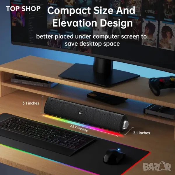 Този Bluetooth високоговорител за компютър разполага с двойни високопроизводителни драйвери и пасивни радиатори за подобрен бас и ясен, завладяващ стерео звук, идеален за музика, игри и филми. Неговият елегантен триъгълен дизайн включва контролен бутон "всичко в едно" за захранване, RGB светлинни режими, възпроизвеждане и превключване на връзката. Предлагайки както Bluetooth, така и AUX свързаност, той позволява безпроблемни преходи без прекъсване на връзката. RGB светлинната лента с четири динамични режима и визуални индикатори за сила на звука добавя жизнено докосване. Съвместим с широка гама от устройства чрез 3,5 mm жак или USB-C, вградената му батерия осигурява преносимост за многостранна употреба.