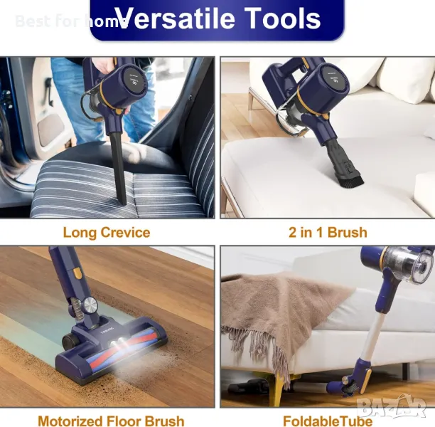 УНИВЕРСАЛЕН - Тази прахосмукачка е идеална за почистване на всякакви отпадъци, като косми от домашни любимци и котешка тоалетна. Три различни глави за аксесоари поддържат 6 комбинации от прахосмукачка с пръчка и ръчна прахосмукачка. Модернизираният дигитален мотор с вградена батерия от 2200 mAh осигурява 2 режима на мощност - по-ниската настройка позволява по-дълго време на работа до 35 минути, а високата скорост носи по-силно засмукване.